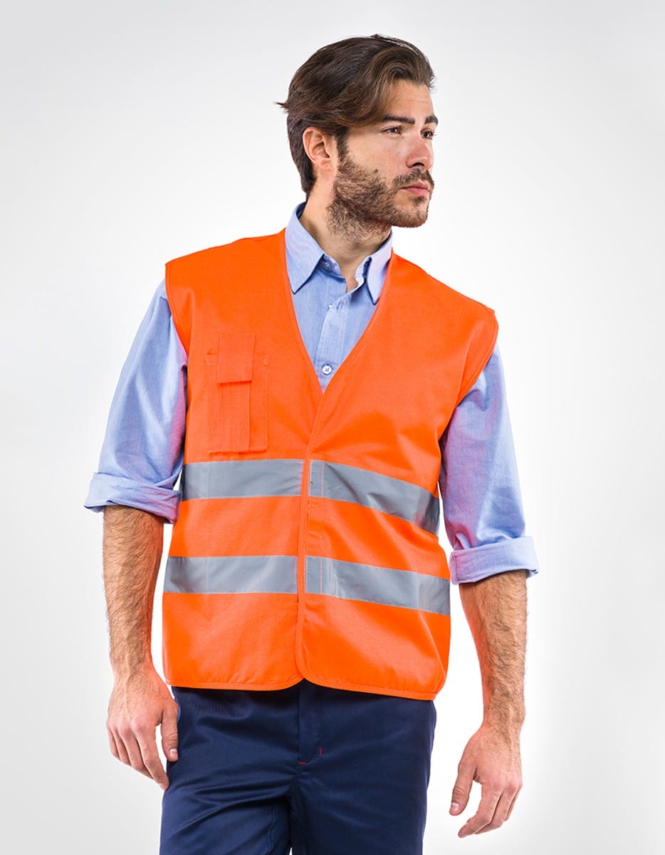 Gilet ad alta visibilità, dotato di pratica tasca porta cellulare sul petto. Chiusura verticale con velcro. Realizzato in 60% cotone e 40% poliestere. DPI 2a Categoria conforme UNI EN ISO 13688 e UNI EN ISO 20471.