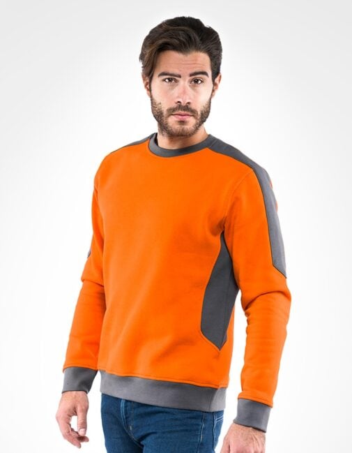 Felpa giorocollo da lavoro bicolore. DPI 1a Categoria, conforme UNI EN ISO 13688, testata per la protezione contro lesioni meccaniche superficiali. Spalle e fianchi in colore a contrasto. Rib in vita e ai polsi. Tessuto in 65% cotone e 35% poliestere.