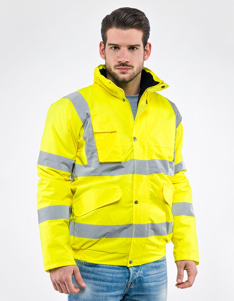 Giubbotto da lavoro imbottito ad alta visibilità, perfetta per lavorare all’aperto e in condizioni di scarsa visibilità. Chiusura centrale con cerniera ricoperta da pattina con bottoni. Due pratiche tasche laterali con pattina. Rib ai polsi ed elastico in vita. Tasca porta cellulare sul petto. Cappuccio a scomparsa richiudibile nel colletto. Interno trapuntato. DPI 2a Categoria, conforme UNI EN ISO 13688, UNI EN ISO 20471, UNI EN 343. 100% poliestere oxford spalmato PU.