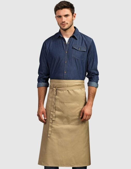 Grembiule lungo in stile bar con grande tasca frontale e taschino per penna, disponibile in una vasta gamma di colori.