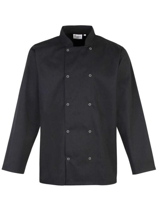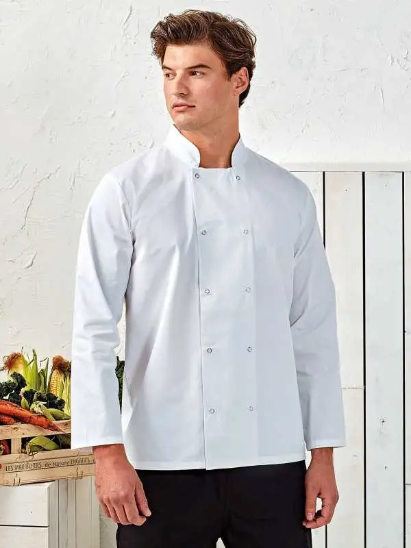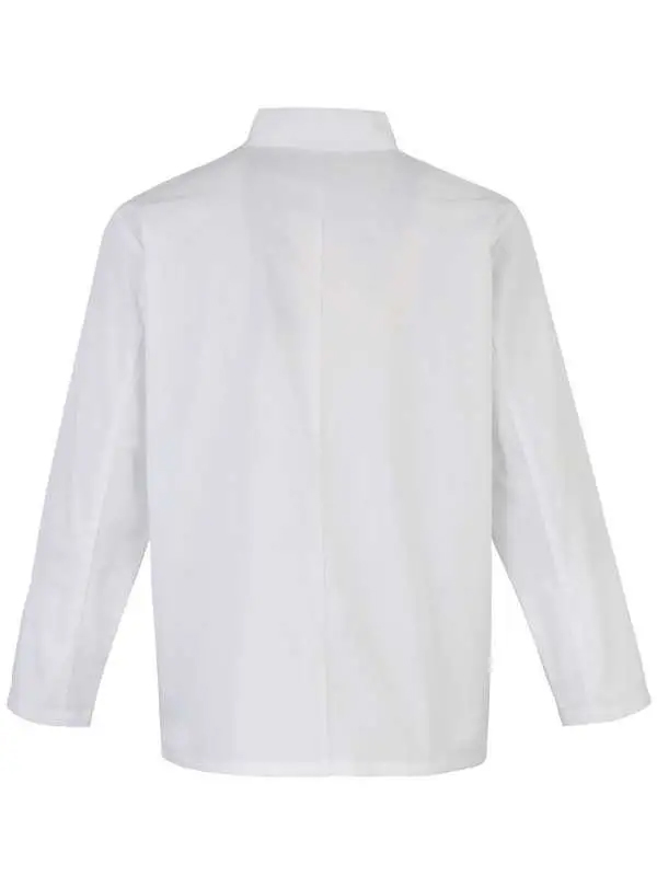 Giacca da chef a maniche lunghe facile da indossare con dieci bottoni automatici in metallo nel classico modello a portafoglio.