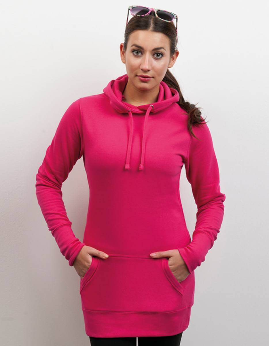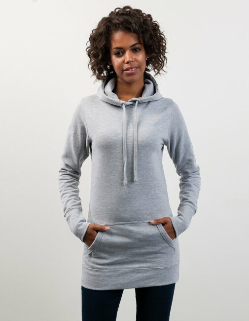 Rivisitazione femminile della classica felpa con cappuccio, questo modello lungo è perfetto sui leggings e sui jeans.