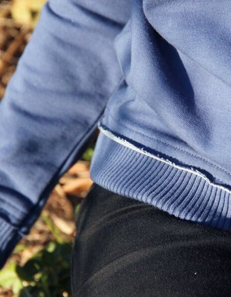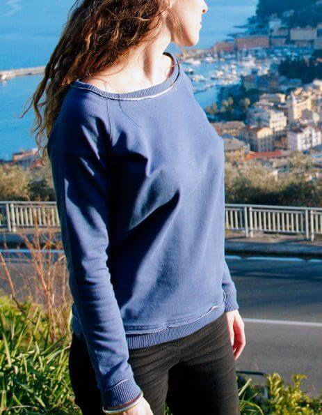Ampio girocollo e taglio maniche raglan, con colletto, polsini e orlo inferiore a coste 2×2.