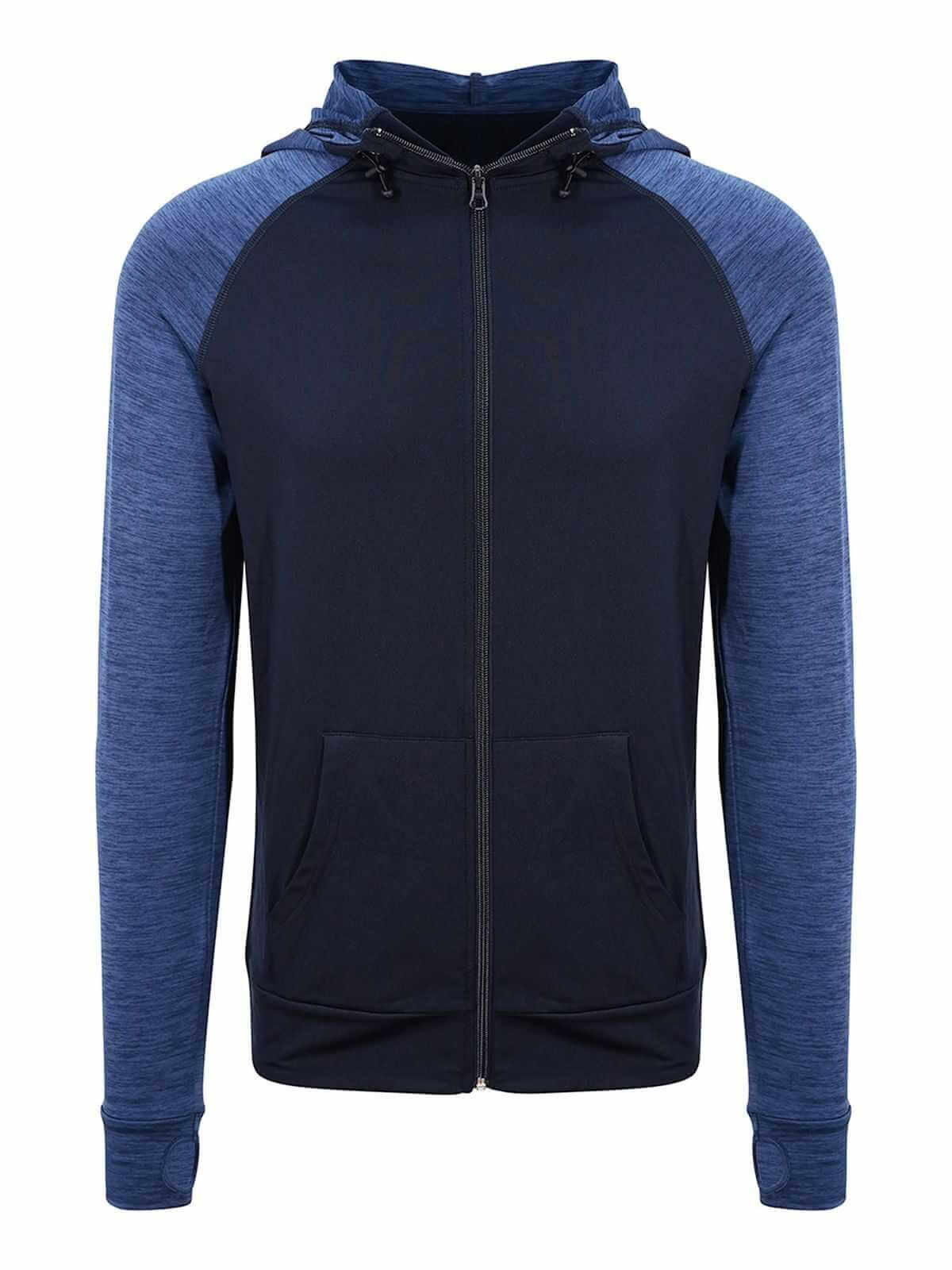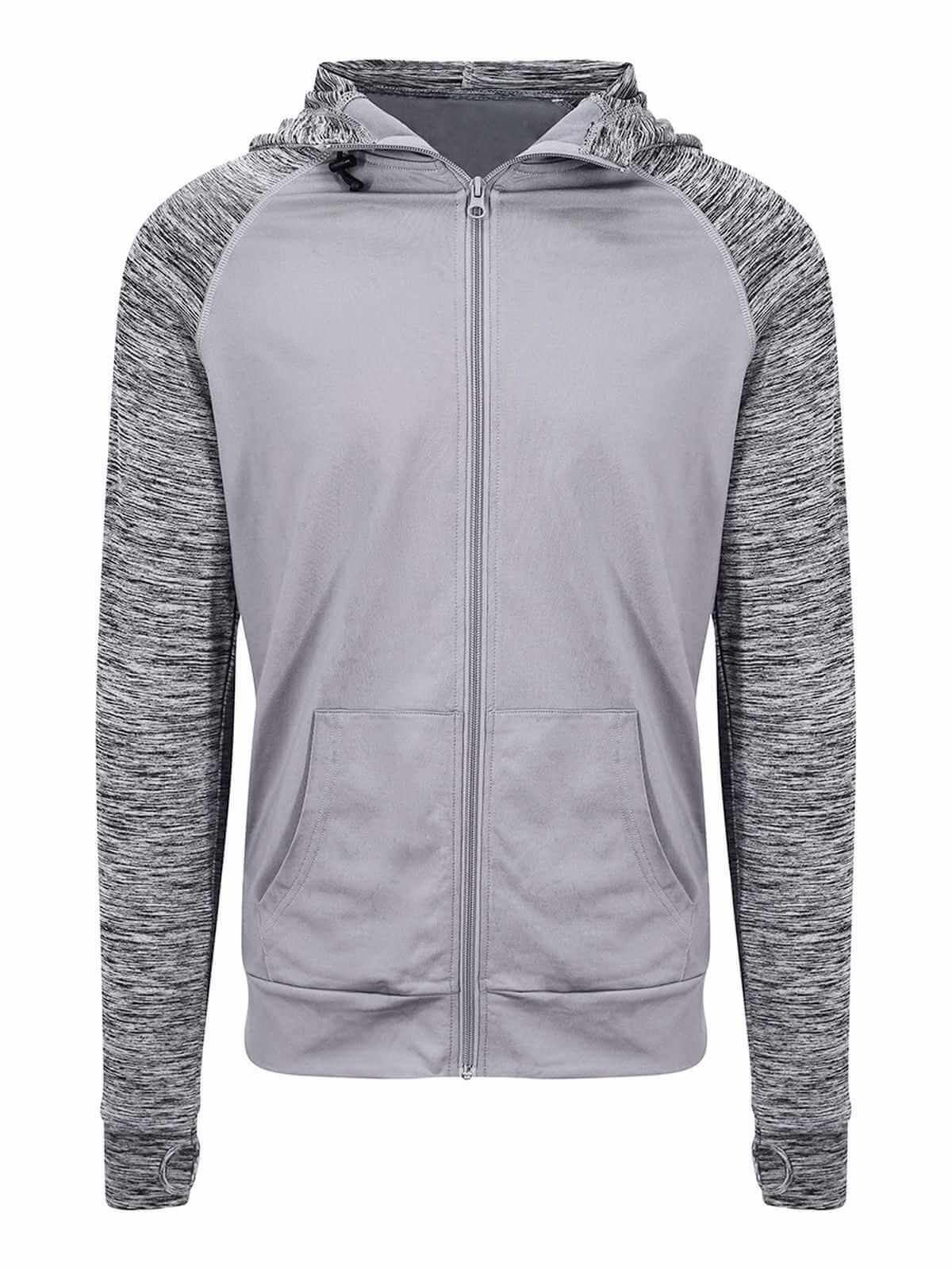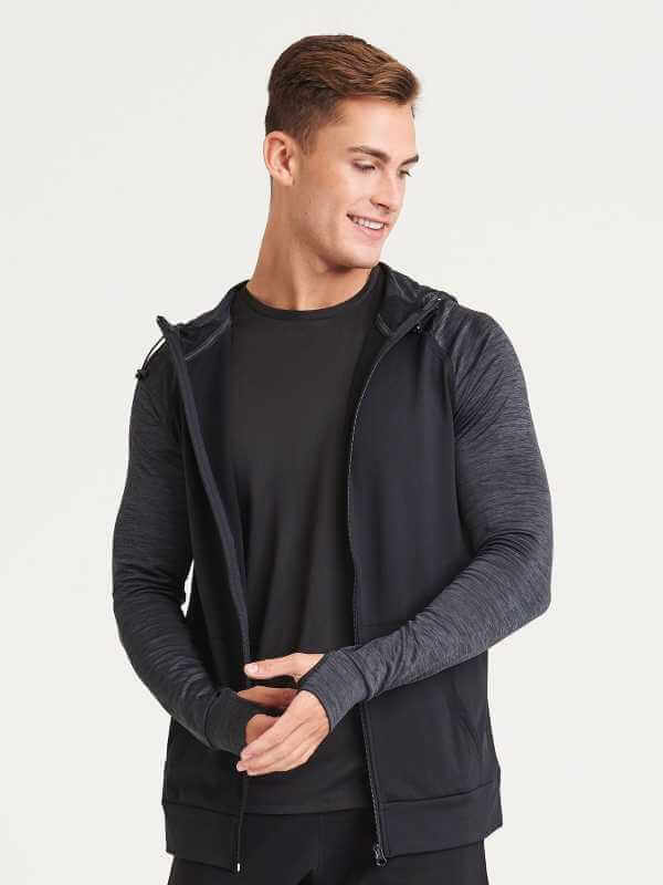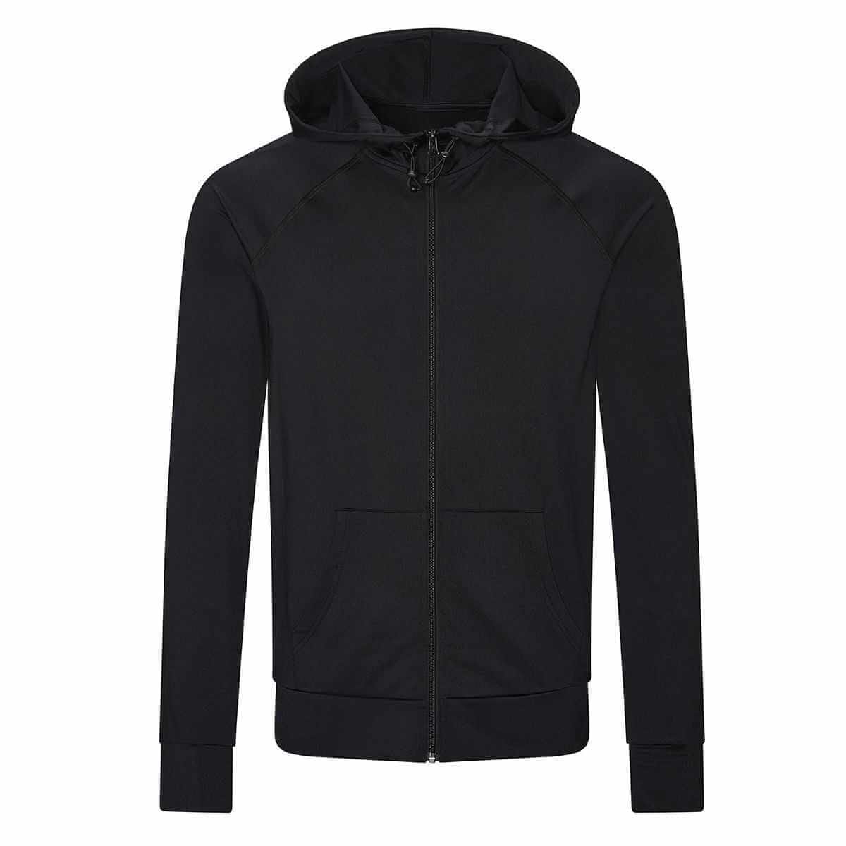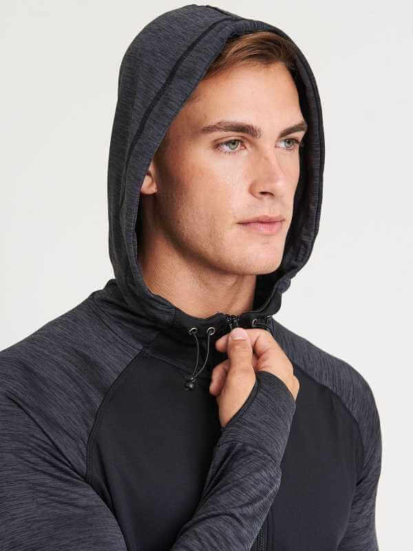 Cappuccio regolabile, tasca a marsupio, zip intera, fori per i pollici.