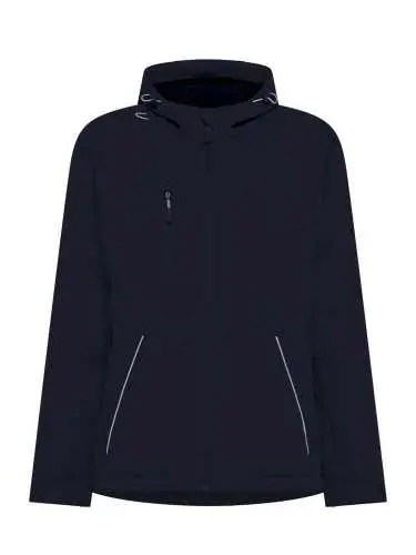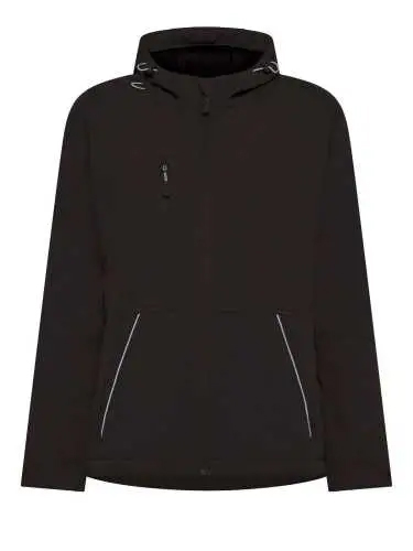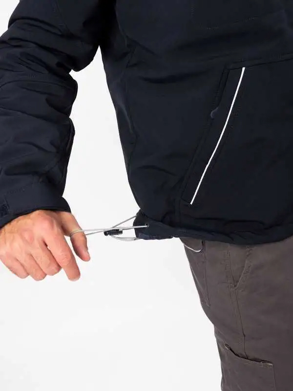 Polsini regolabili con strappo. Cappuccio e vita regolabili con coulisse. Due tasche frontali con zip e fibra riflettente e tasca sul petto con zip, una tasca interna con zip.