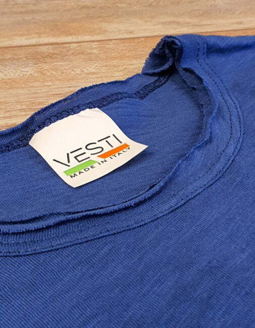 Realizzata in 100% cotone con effetto fiammato, interamente Made in Italy. Comoda scollatura tonda con taglio vivo su colletto e maniche.