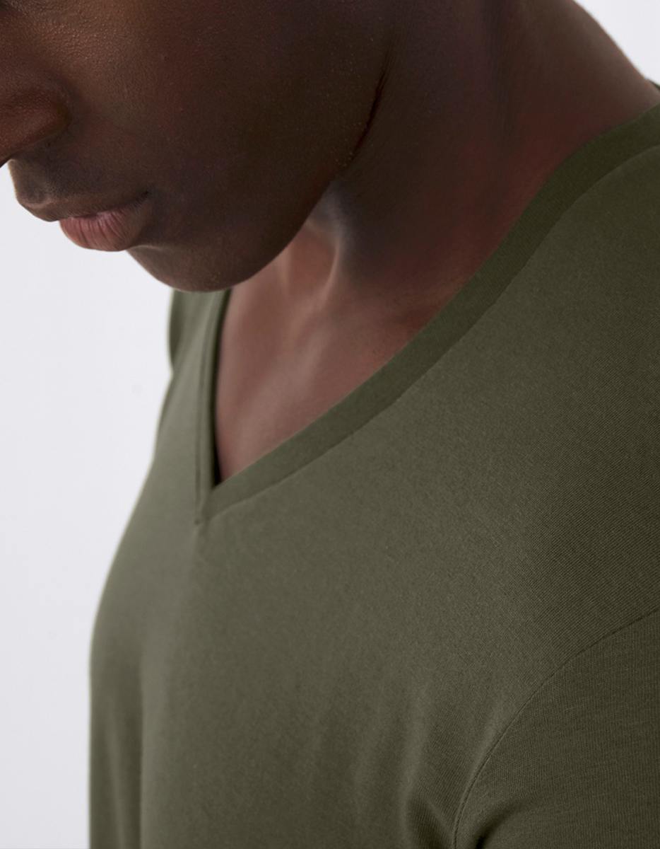 Maglietta a manica corto con colletto a V, realizzata in 100% cotone organico morbidissimo al tatto.