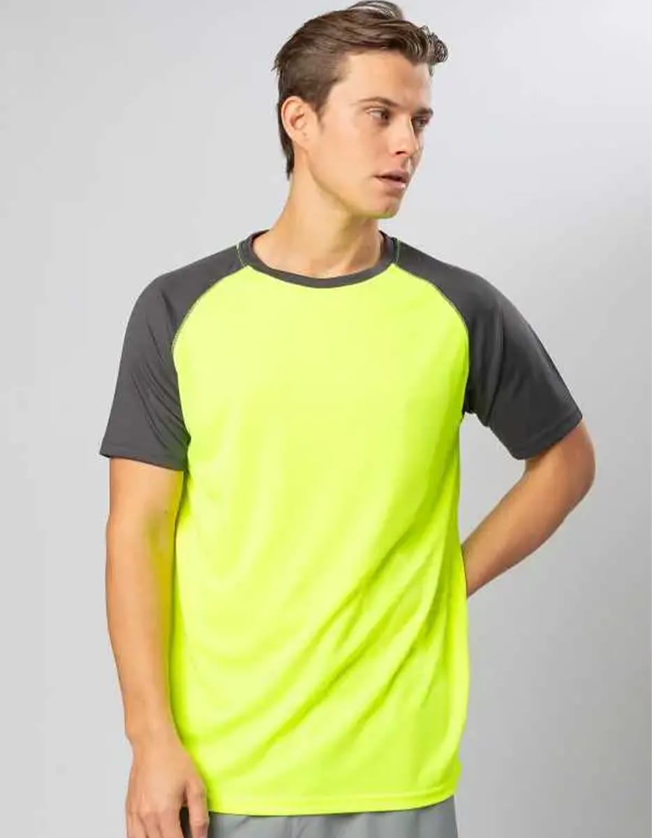 Maglietta bicolore con maniche raglan, realizzata in tessuto tecnico perfetta per lo sport. Traspirante, comoda e dal taglio classico. Girocollo e maniche colorate a contrasto. Cuciture flatlock per un maggiore comfort e struttura con cuciture laterali. Etichetta removibile. 100% poliestere.