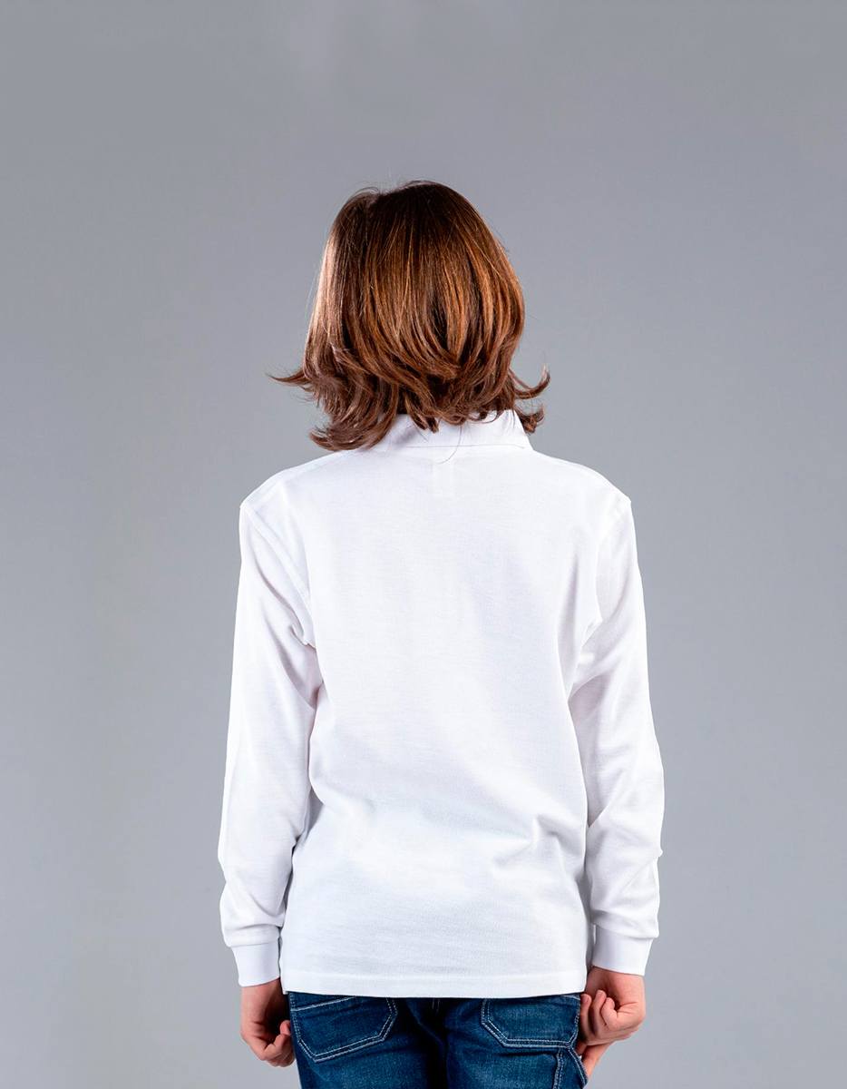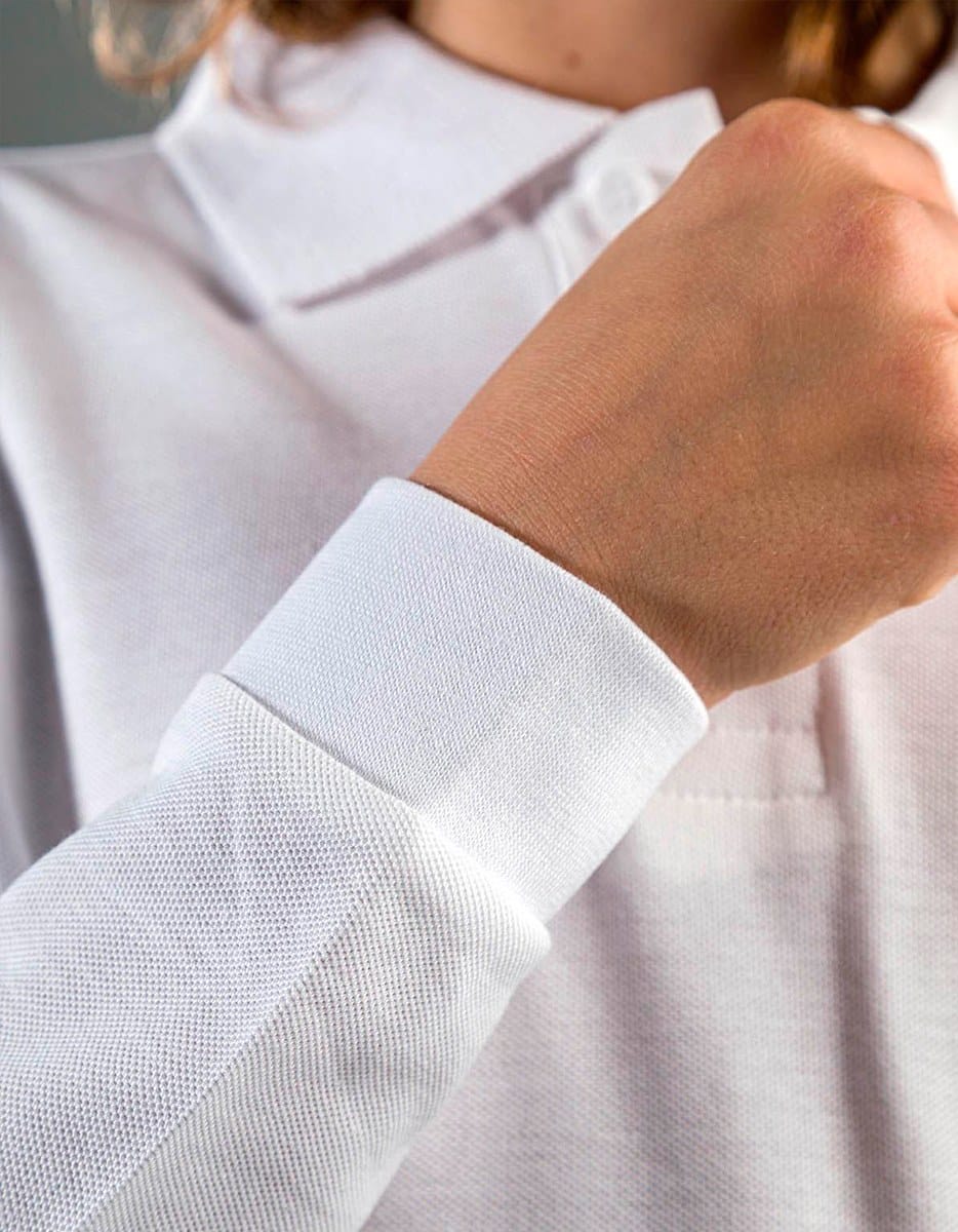 Due bottoni tono su tono, collo e polsini in costina 1×1.