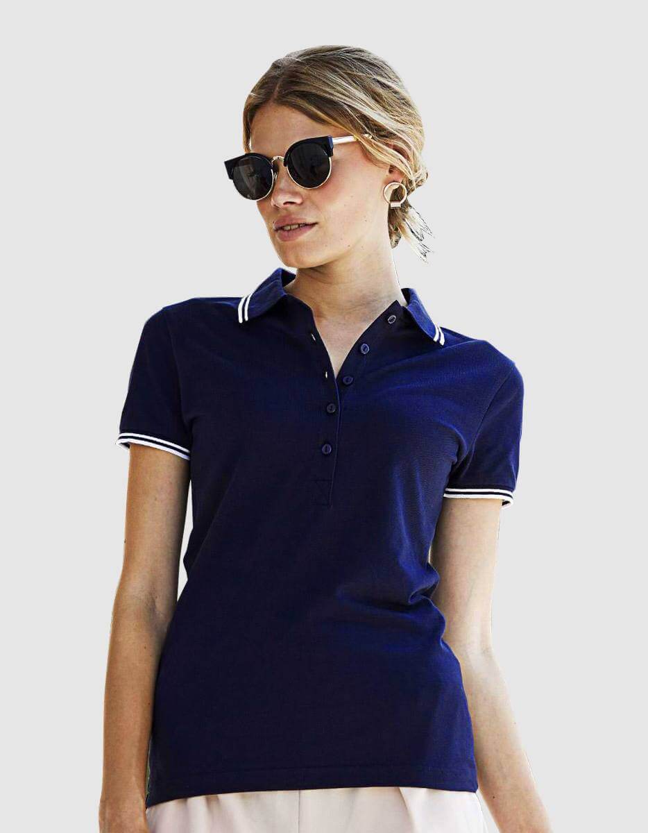 Polo a maniche corte per donna elegante e sportiva allo stesso tempo. Doppie righe di colore a contrasto su colletto e polsini, per un tocco di stile in più. Taglio classico e chiusura con 5 bottoni tono su tono, realizzata in 95% cotone e 5% elastane.
