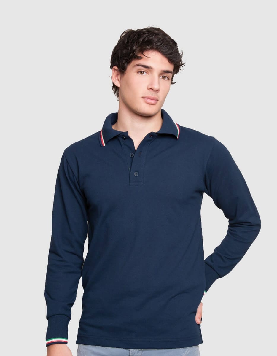 Polo a maniche lunghe per uomo, in 100% cotone e realizzata interamente in Italia a partire dal filato. Finiture in tricolore italiano su polsini e colletto. Chiusura del colletto con tre bottoni tono su tono. Perfetta per la tua attività o evento.